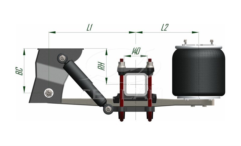 Номер | Артикул подвески | Допустимая нагрузка на ось (кг) | Тип осевой балки | Клиренс(высота езды)(мм) | Амортизатор | Тип пневмрподушки | L1- | L2- | BC-(мм) | AT-(мм) | Мин. габаритная высота | |||