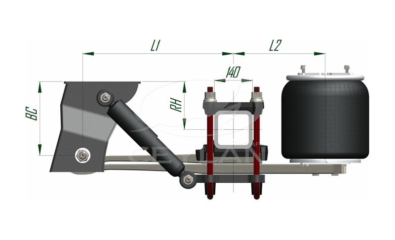 Номер | Артикул подвески | Допустимая нагрузка на ось (кг) | Тип осевой балки | Клиренс(высота езды)(мм) | Амортизатор | Тип пневмрподушки | L1- | L2- | BC-(мм) | AT-(мм) | Мин. габаритная высота | |||